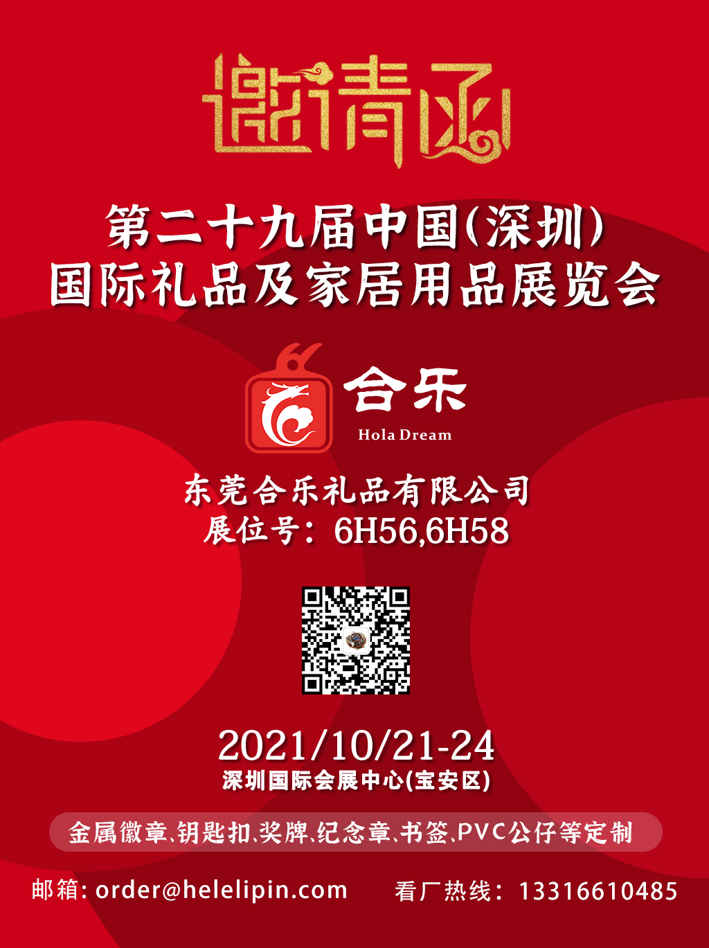合樂禮品向各位新老客戶發出誠摯的邀請,期待與您相約在金秋十月的鵬城。合樂禮品依托集團發展,37年專業設計定制生產琺瑯徽章、紀念章、金屬勛章、獎牌、鑰匙扣、PVC軟質公仔盲盒等工藝禮品。我們已經準備好相關產品,并將竭誠為您解答各類產品專業技術問題和疑惑。您可以看到我們的新產品與服務領域,了解到我們的工廠規模與實力,感受到我們的服務熱情。